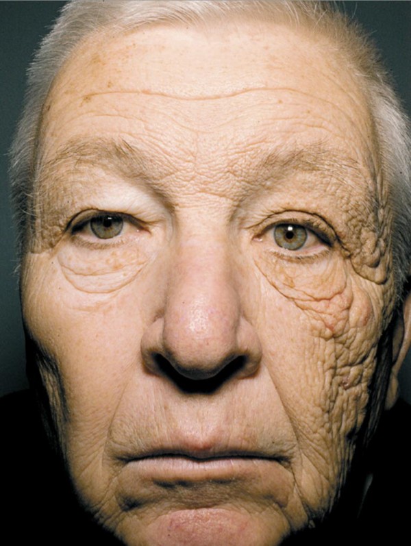 Por conta de seu trabalho como entregador, esse senhor passou 28 anos de sua vida fazendo certas rotas dirigindo um caminhão e expondo mais seu lado esquerdo do rosto ao sol. Os raios ultravioleta do sol refletiam em sua janela e atingiam a sua pele em maior quantidade do lado esquerdo, o que provocou envelhecimento cutâneo, ou fotoenvelhecimento.